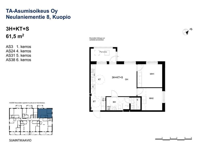 Huoneistoala yhteensä:61.5 m²