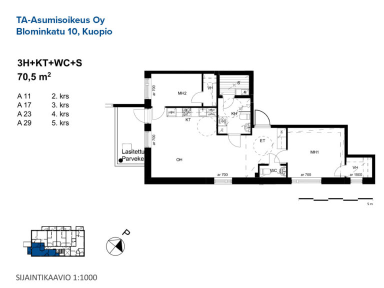 Huoneistoala yhteensä:70.5 m²