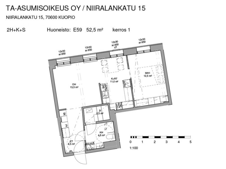 Huoneistoala yhteensä:52.5 m²